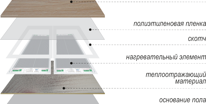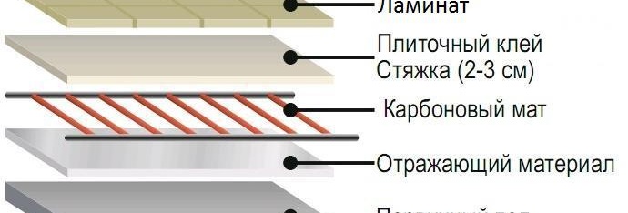 Преди ламиниран паркет на пода на филма трябва да го проверите, след което полагаме защитния материал (пластмасово фолио). Резултатът е конструкция с незначителна дебелина, която не оказва влияние върху разстоянието между тавана и пода на помещението. Дори може да се нарече най-доброто подово отопление под ламинат.