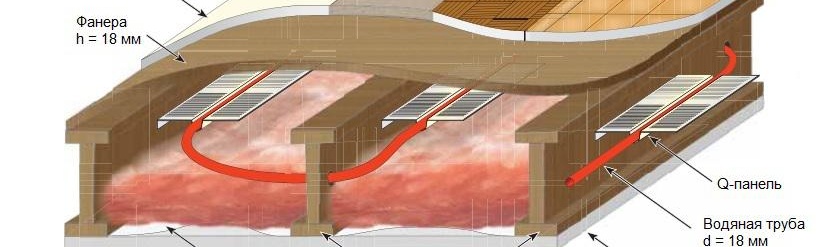 Подът с водно отопление е направен на няколко слоя: хидроизолационен слой, полагане на амортисьорна лента около периметъра на стените на помещението, слой топлоизолация, монтаж на нагревателни елементи (тръби), бетонна замазка ( в редки случаи гипсокартонени материали). Едва когато това е направено, можете да започнете ламиниран паркет. От предимствата си струва да се подчертае надеждността на цялата конструкция, безопасна употреба без страх от изгаряне и липса на зависимост от електричество.