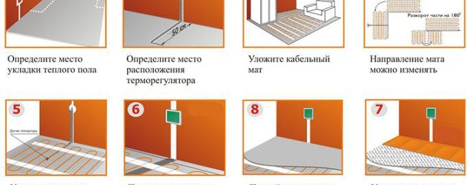 Първоначално в стените са монтирани места за монтиране на контроли и под тези елементи е монтирана кутия. Изводите на захранващите кабели на този етап просто се вкарват в кутията и се изолират, трябва да се спазват предпазните мерки на всички етапи на монтажа. Гофрираните ръкави се полагат от кутията в подготвената стена в стената - едната за температурния сензор, втората за отоплителния кабел. Гофрирането на сензора е опънато на 1 до 1,5 метра по земята. Краят е изолиран с PVC лента, за да се предотврати проникването на бетонов разтвор и влага във вътрешността на гофрата.