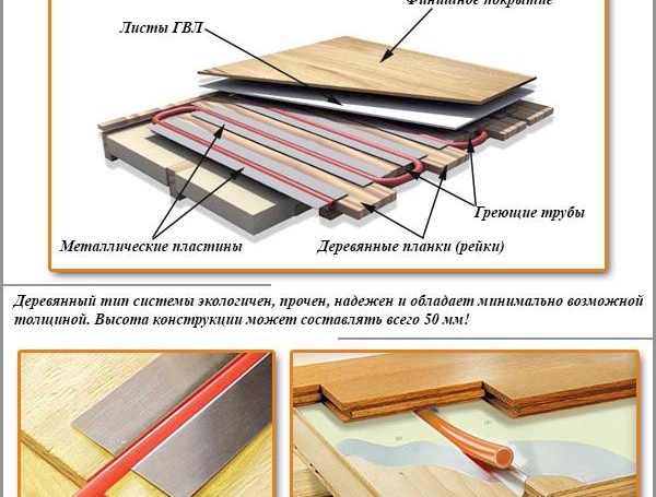 - В дърво. Тук се използват дървени плочи, от едната страна на които има специални канали, където се поставят тръбите.Тази система може да се монтира по същия начин като полистирол.