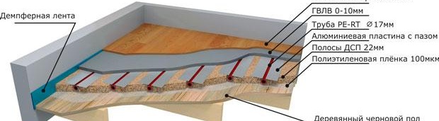 Тази версия на устройството за топъл воден под е идеална за помещения, където при определени обстоятелства не е възможно да се напълни Бетонна замазка. Най-често това са дървени сгради, помещения, където таваните вече са много ниски, а също така може да има ситуации, когато проблемът е в доставката на бетон до работното място.