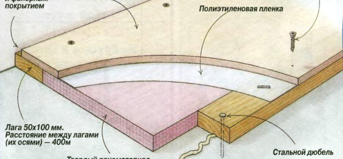 Но първо се прави настилката на хидроизолационния слой. Изолацията трябва да бъде напълно защитена от проникване на влага. Те са приковани към положените трупи листове шперплат оставяйки разстояние от 16-20 мм от стените. В крайна сметка остава само да се направи настилката от избраната настилка. Това ще завърши настилката на стаята, която ще стане горещ, и няма да губи топлината на помещението.
