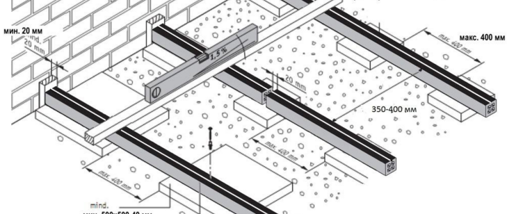 - Изолиран подов пълнеж. Разтворът трябва да се излива с дебелина най-малко 50 mm.