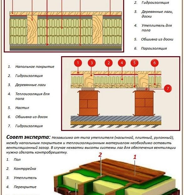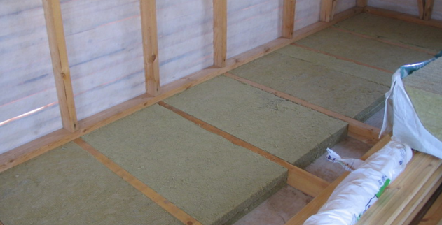 При затопляне можете да използвате различни опции за полагане на материала. Сред тях се отличава полагането на изолация върху бетонна основа. чрез офсет. След това се извършва само обшивка на плочите върху трупите и закрепване. В образувалите се кухини е положен радиатор, както и всички възможни комуникации в апартамента. В този случай няма да има натоварване на материала. Следователно могат да бъдат закупени и използвани насипни материали под формата на експандирана глина или минерална вата.