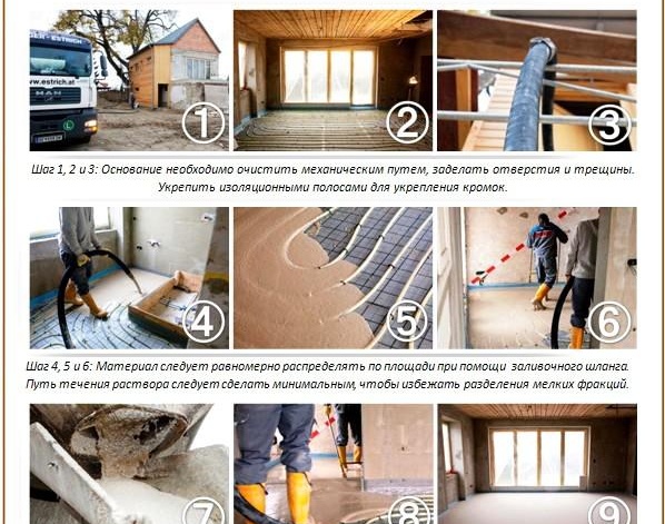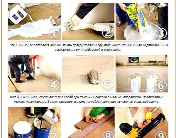 Използването на саморазливни смеси в работата не създава специални трудности. Те са много прости и лесни за месене: необходимото количество вода се добавя към сместа, след което се излива върху повърхността на почвата. Дупките и дефектите се запълват напълно и се създава равномерна основа. Освен това има още един набор от положителни качества: