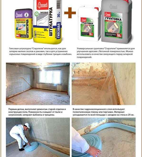 Старите бетонни подове показват отрицателни качества с течение на времето. Това могат да бъдат пукнатини, дупки, чипове и други дефекти. Можете да затворите всяка дупка поотделно или да изравните земята с тънък слой. Тези съединения имат достатъчен брой положителни качества, които могат да изсъхнат за кратко време и можете да започнете да довършвате. В допълнение, здравината на основата ще бъде дори по-добра, отколкото при изливането на бетон.