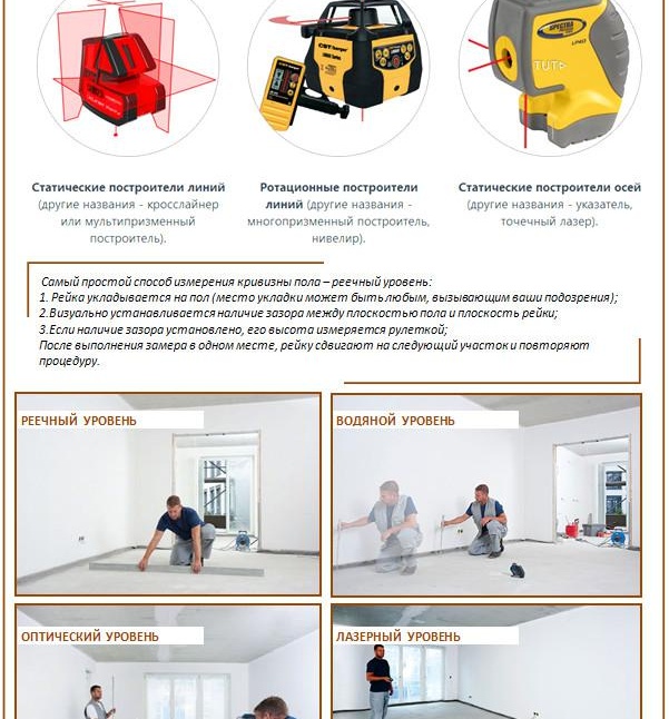 Основата за изтегляне, както и нейната кривина, ще повлияят на общото състояние на пода след завършване замазки. Поради тази причина трябва да се направят измервания на почвения хоризонт. За да направите това, ще трябва да използвате специални инструменти, като хидравлично ниво или лазерно ниво. За малки пространства е подходящо и обичайното ниво на конструкция. Но дължината не винаги ще бъде достатъчна за пълно измерване. В този случай можете да поставите линийка отдолу, в горната част на която е поставено ниво.
