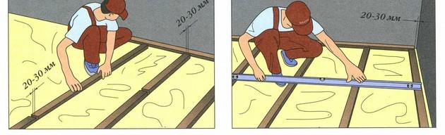 Що се отнася до предварителната инсталация на изоставането, подът обикновено се прави от нулата. Дървените трупи се закрепват с ниво, като се избира точната височина. За закрепване се използват самонарезни винтове.