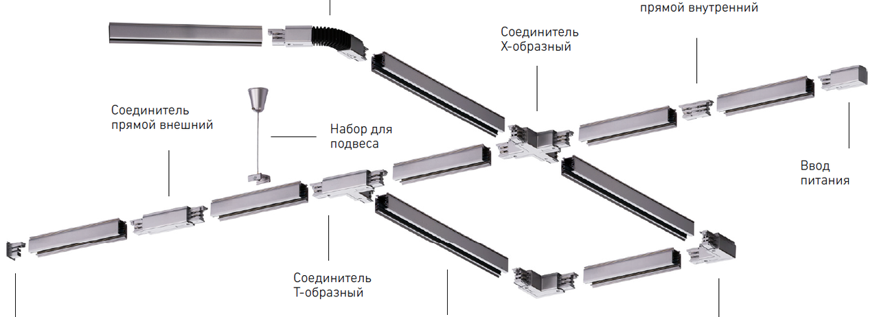 Свързващите елементи и крепежни елементи за поставяне на релсови системи позволяват поставянето им не само на всякаква височина, но и на различни равнини - както хоризонтални, така и вертикални. На шинопровода е разрешено да се монтират лампи с различна мощност и тип, като броят им може лесно да се променя в зависимост от задачите на системата.