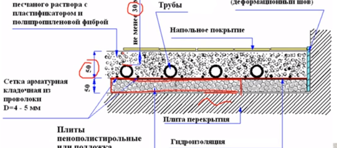 Когато няма такива жлебове, се полага армиращ слой, към който са прикрепени тръбите на цялата система. Над тръбите може да се постави и допълнителен слой армировка. В този случай надеждността на цялата конструкция се увеличава значително.