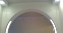 Когато се монтира опънатият таван, дупките се изрязват във филма и се залепват с изолационни пръстени. Тогава монтирани са лампи.