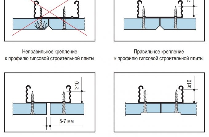 Закрепването на гипсови строителни плоскости и гипсофазерни плоскости към профили (шини) се извършва предимно върху носещите профили. За да се улесни последващото шпакловка, се препоръчва предварително да се изрежат листовете, прилежащи към дългата страна на стената