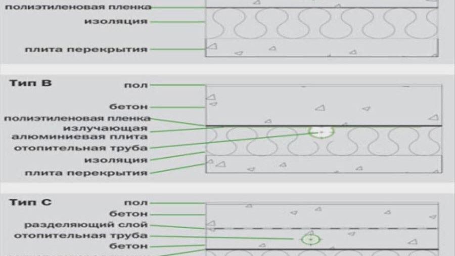 Тип А". Този тип е най-простият по отношение на подово отопление и най-малко взискателен по отношение на работата. На подовата плоча се полага изолационен слой и се полага полиетиленов филм. Повече отоплителна тръба системите на изолирания воден под се държат директно в бетонен съединител. Остава само да изчакате, докато повърхността изсъхне напълно, за да завършите подовата настилка под формата на подова настилка.
