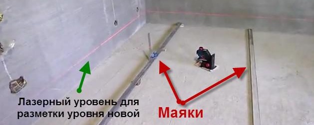 След това се определят най-високата и най-ниската точка на помещението. От най-високата точка се маркира разстояние, равно на дебелината на бъдещата замазка. След това дължината се измерва от стандарта до маркировката с дебелината на замазката. Подобно разстояние от нормата се отбелязва по целия периметър на стаята. Ако свържем тези точки заедно, получаваме ниво нула. Той ще служи като ръководство за последващо инсталиране на маяци за изливане на замазката.