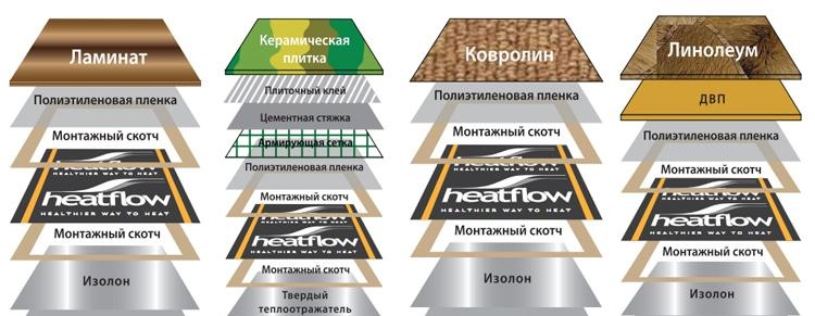 Върху съществуващата подова основа се полага слой хидроизолация, върху който се полага топлоизолационен отразяващ материал. Последният е основата на системата за подово отопление. Остава само да се произведе подовата настилка от инфрачервено фолио. Филмовите листове на някои места са свързани помежду си, след което са свързани към електрическата мрежа.