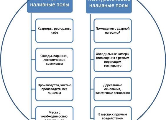 дивизия саморазливни подове може да се направи в много посоки. Най-основният от тях е съдържанието на сместа, използвана за работа. Тук можем да отбележим: