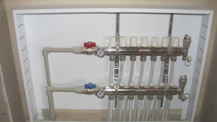 За да поставите колектора в стаята, колекторният шкаф е предварително фиксиран. Когато всичко е готово, шкафът е отворен тръба захранване със студена и топла вода, което е свързано към съответните секции на колектора.