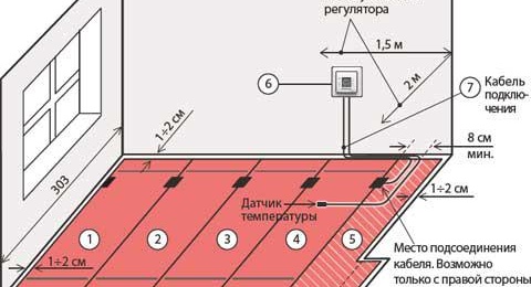 - Избира се мястото на закрепване на температурния сензор на изолиран под. Обикновено изберете място близо до самия термостат. В този случай не трябва да има мебели наблизо. По малко по-различен начин сензорът се фиксира от инфрачервените подове - от грешната страна на филма, след което се свързва към кабела, който отива към термостата.