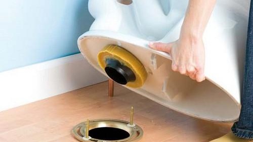 - Поставете тоалетната на място и проверете дали всички докинг дупки се събират. След това устройството се завърта малко, което води до кръстовището на двата елемента. Между частите е поставен уплътнителен пръстен, който гарантира херметичността на връзката.