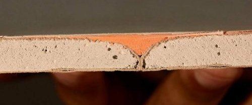 изрязани ръбове на гипсокартон, скосени под 22,5° на 2/3 от дебелината