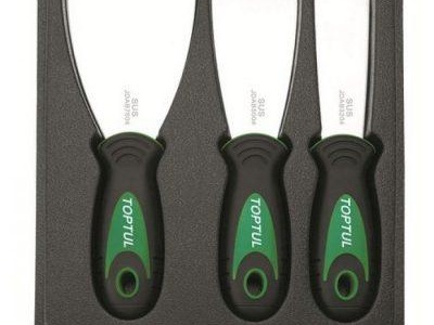 - Комплект шпатули. Шпатула с тясна шпатула (8 см), композиция (до 15 см), голяма шпатула шпатула (до 40 см). Струва си да се обърне внимание на гъвкавостта на метала. Колкото повече се огъва острието, толкова по-лесно се работи.