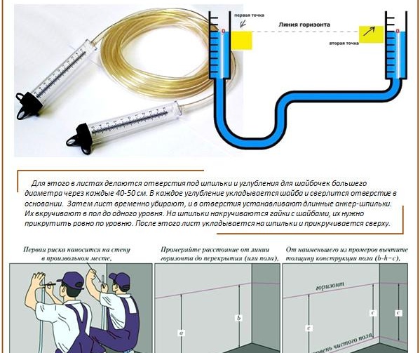Можете да изравните сместа с помощта на владетел или специално оборудване "Хеликоптер". - Използването на листови материали - шперплат или други панели. Засипването обикновено се извършва предварително. сухо вещество, над който са закрепени посочените елементи. Процесът не отнема много време и може да се направи дори от начинаещи. Дебелината на замазката обикновено е между 30 и 100 mm.