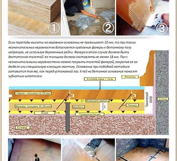 Всички налични дюбели рядко се запушват и между всеки от листовете материал се оставя празнина, която след това се запечатва с водопроводна лента. Между стената се оставя подобна празнина. Ще бъде достатъчно за 1 см. В допълнение към бетонните подове, шперплатът може да бъде идеално изравнен и стар дървени цокли.