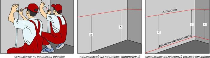 Работата се извършва от двама души. След като поставите първата бутилка в ъгъла на стаята, направете първата маркировка.Това ще определи бъдещото ниво. Втората колба се премества от друг човек по определената стена на определено разстояние, за да я постави. След задаване на същото ниво на течност във флаконите се прави подобна маркировка. След това тези знаци се свързват помежду си. Трябва да се отбележи, че колкото по-далеч са разположени тези точки по периметъра на помещението, толкова по-вероятно е да се направят точни изчисления.