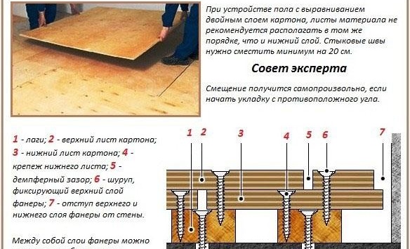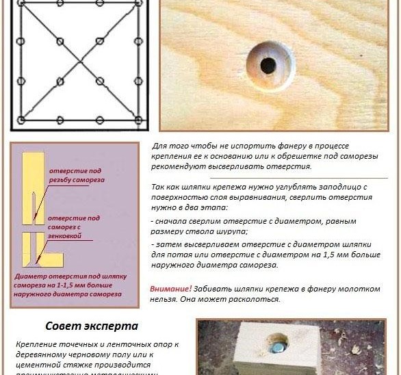 Когато всичко по-горе е направено, можете изравнете земята шперплат. За закрепване на листовете се избира една от горните схеми. Няма да е излишно всеки елемент от шперплат да се третира с антисептик. Закрепването обикновено се извършва с помощта на самонарезни винтове с пластмасови дюбели. За да не се напука листът от шперплат, дупките са предварително пробити.