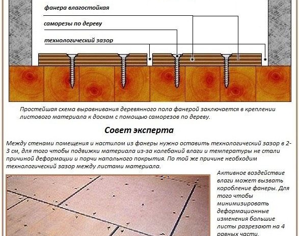 В някои случаи се използва лепило за шперплат. Най-важното е, че е на основата на борова смола. За закрепване на листовете към основата се използват дюбелни винтове. Лепилото се нанася не само върху основата, но и върху вътрешната страна на листа от шперплат.След полагане върху повърхността те веднага се завинтват със самонарезни винтове. Веднага след като приключи полагането на всички листове на пода на стаята, е необходимо да започнете да работите със шевовете. Обработват се с шпакловка, гипсова или акрилна шпакловка. Остава само да запечатате горната част с монтажна лента.