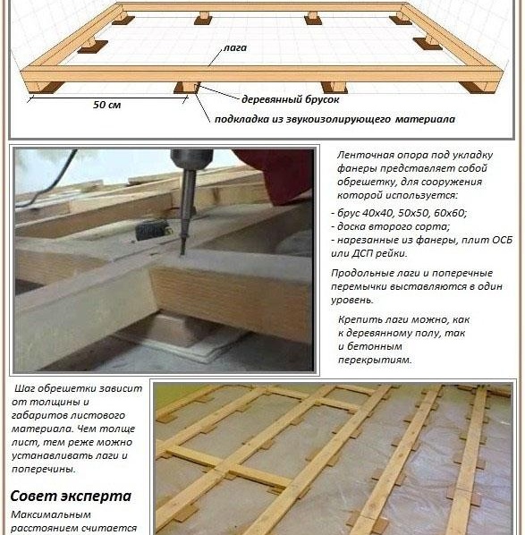 Дървени блокове, шперплатови плоскости могат да служат като труп. Ширината се взема най-малко 30-40 mm. Закрепването към основата се извършва с помощта на самонарезни винтове или с лепило. За да запълните пространството между лаговете, се използва специален мастик. Можете също така да поставите слой топло и звукоизолация.