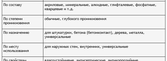 Днес се произвеждат различни видове грундиращи смеси за различни видове основни стенни материали: