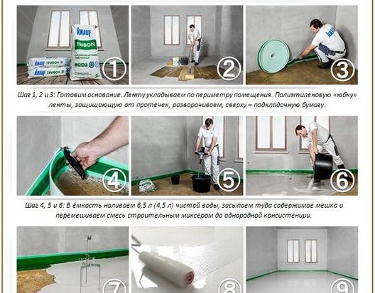 Монтажът се извършва с асистент, особено ако стаята е достатъчно голяма. Отговорностите са разпределени между всеки от изпълнителите, които трябва да се следват: пригответе разтвора, изсипете, разпределете готовата смес върху повърхността с шпатула.